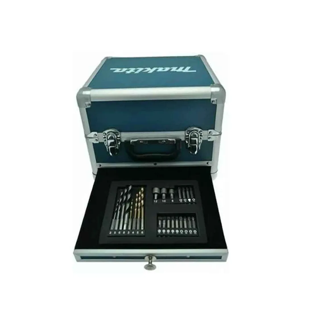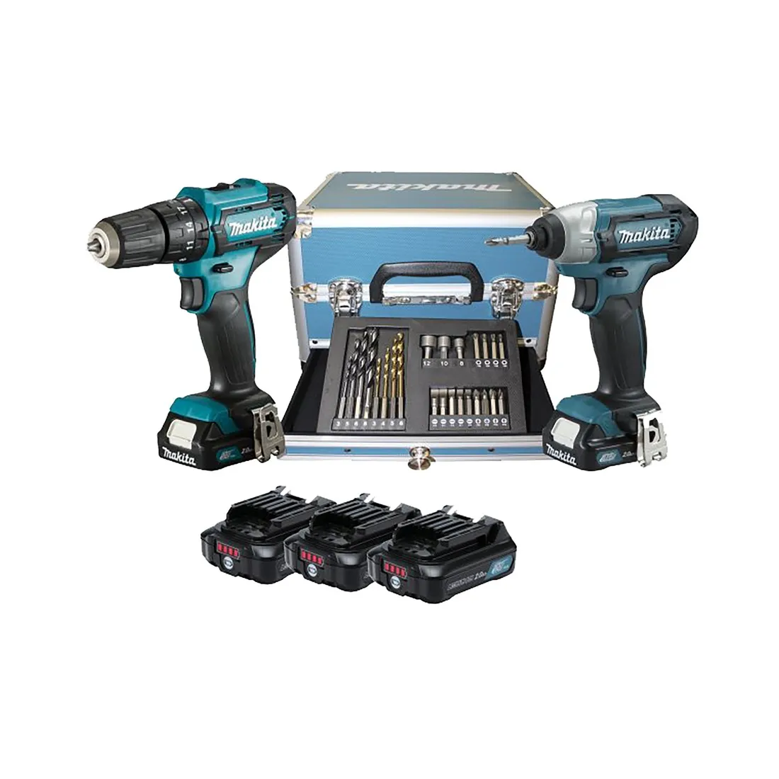 Makita CLX228SAX2 include Trapano avvitatore Makita HP333D, Trapano ad impulsi 1/4" TD110D, 3 Batterie 12V 2Ah, Carica batteria singolo 12V, Valigia in alluminio e Set di inserti e punte