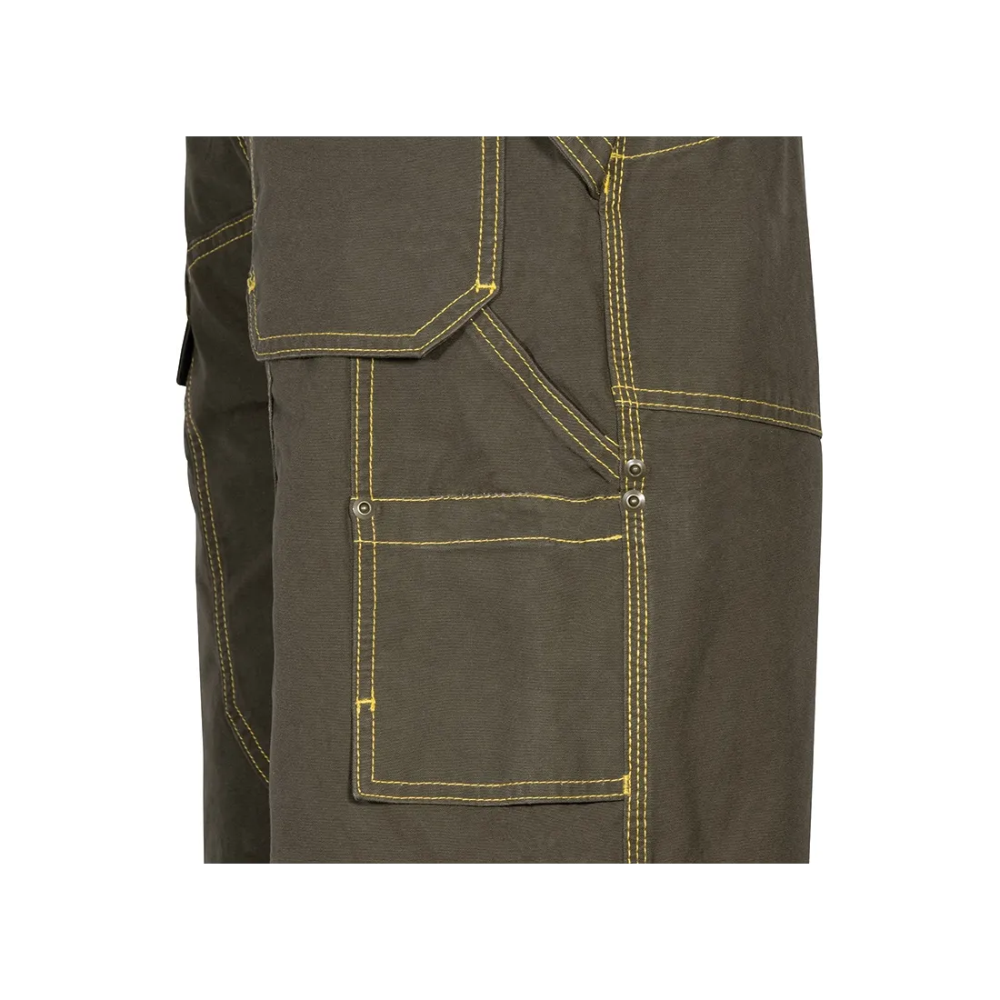 doppia tasca posteriore di cui una con pattina, inserto portapenne, passante porta martello, tasca laterale sinistra con pattina, tasca porta metro, vita regolabile