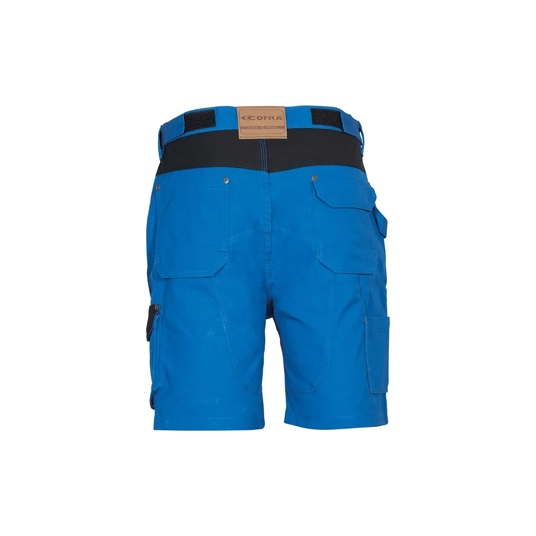 doppia tasca posteriore di cui una con pattina, inserto portapenne, passante porta martello, tasca laterale sinistra con pattina, tasca porta metro, vita regolabile