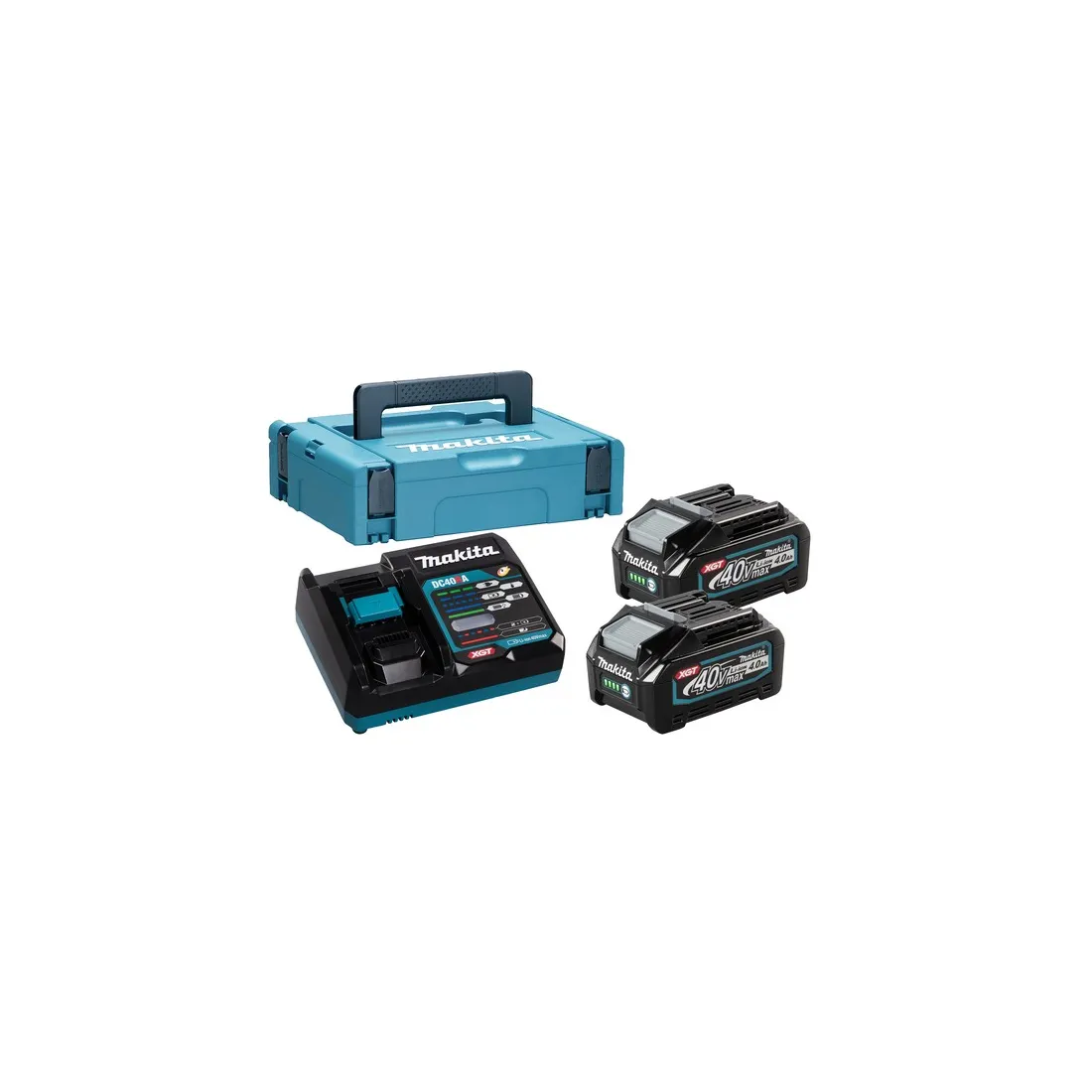 Un pratico caricabatterie per utensili XGT® 40Vmax. Valigetta Makpac contenente due batterie agli ioni di litio da 4,0 Ah dotate di indicatore di livello batteria e una caricabatterie rapido che carica una batteria da 4,0 Ah in 45 minuti.