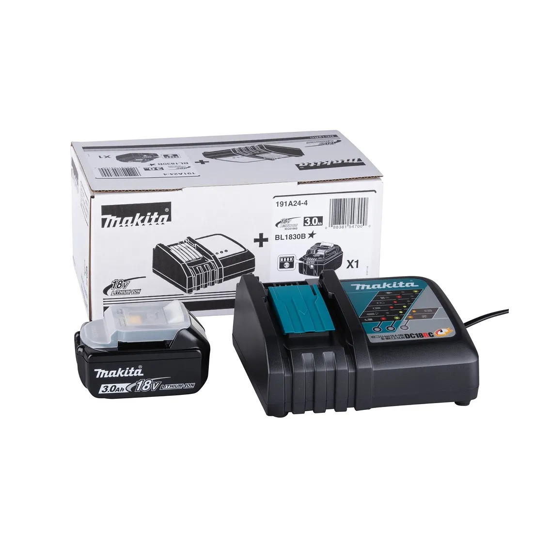 Il Kit energy 3.0 ah Makita 191A24-4 è una pratica soluzione fornita con batteria BL1830B e caricabatterie rapido D18RC.